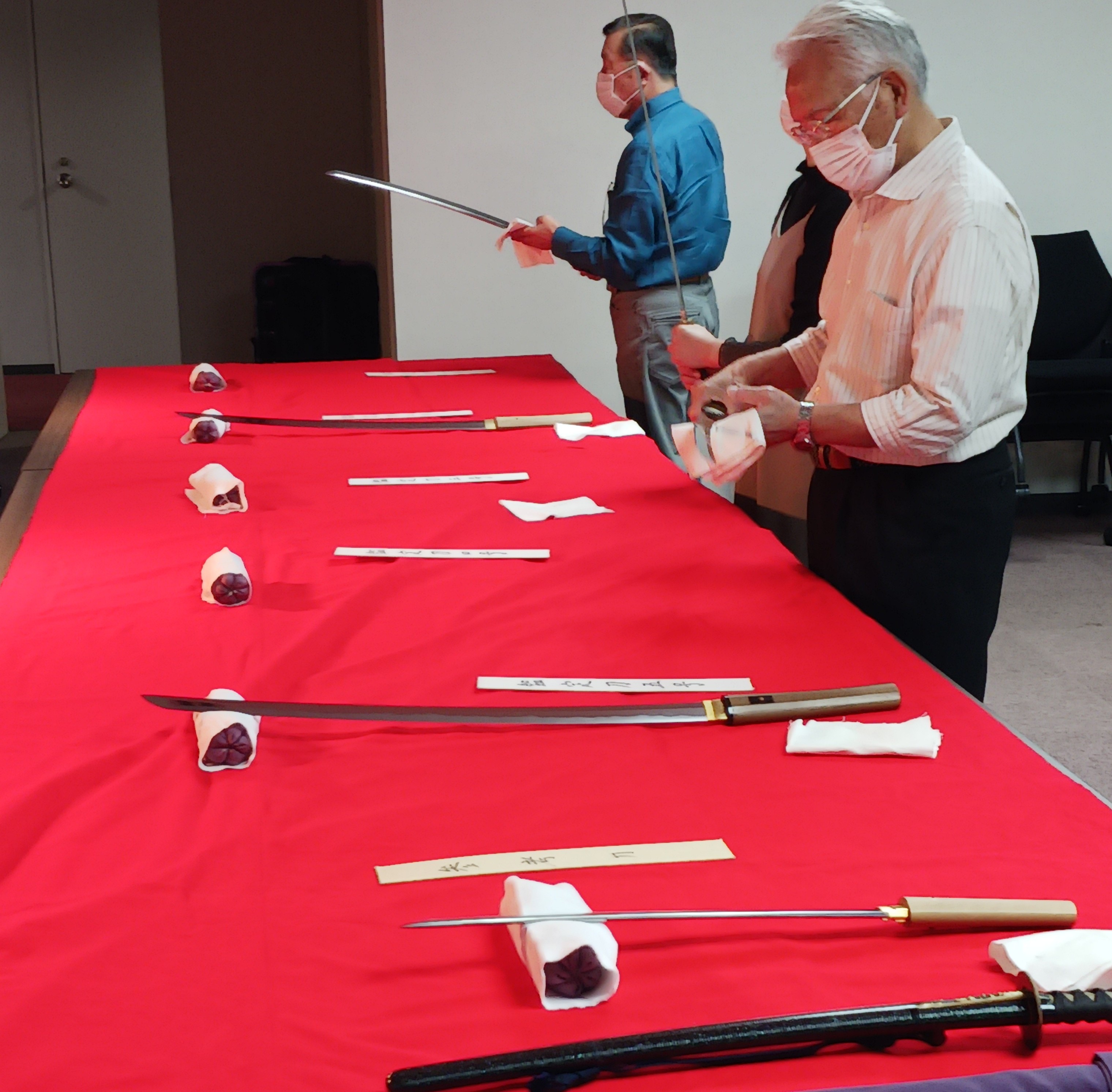 写真のように、今年も15口の名品、珍品、掘り出し物が揃いました。平安期の古伯耆・古備前、鎌倉末の山城、室町期の備前、江戸、令和と日本刀のほぼ全期を網羅しました。